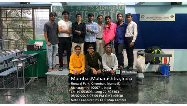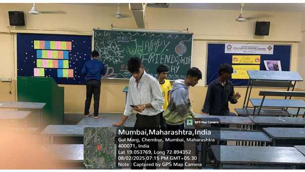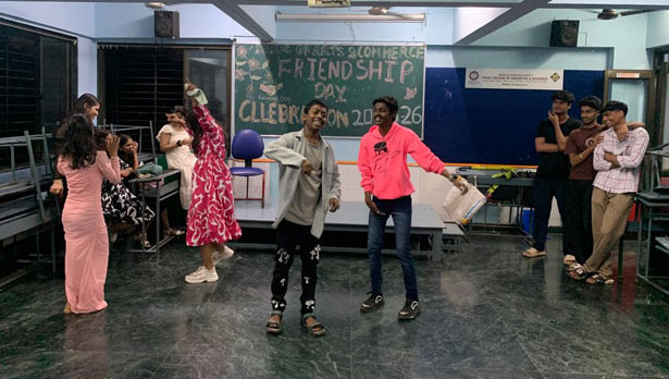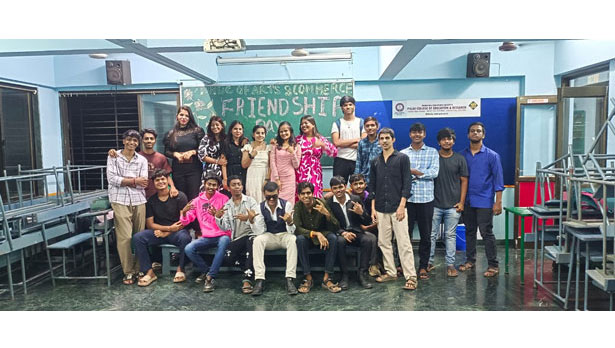 The students created space for themselves by removing benches from the class and set up the floor for games and dance. They played Bombing the Station which is a group version of musical chairs and danced happily to recorded music of their choice. All three classes F.Y.B.Com., S.Y.B.Com., and T.Y.B.Com., had decorated their black board and written a welcome board for Friendship Day.
