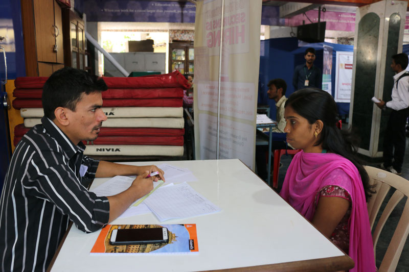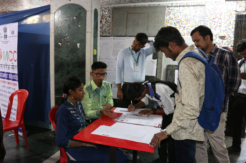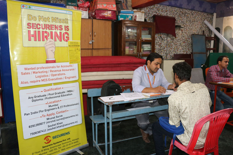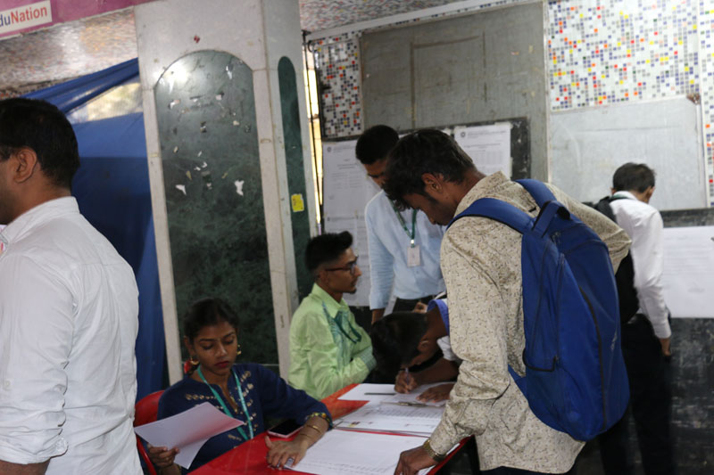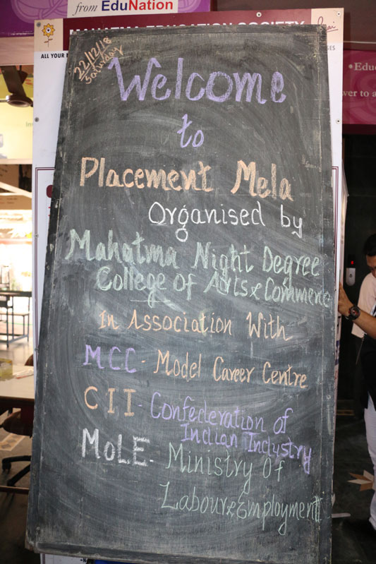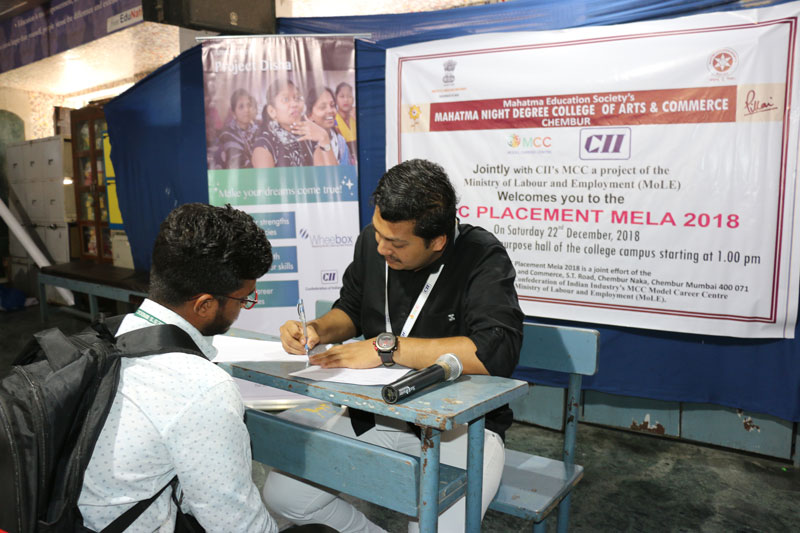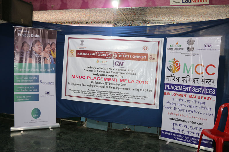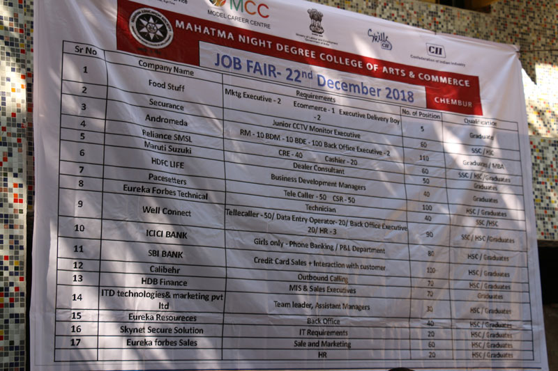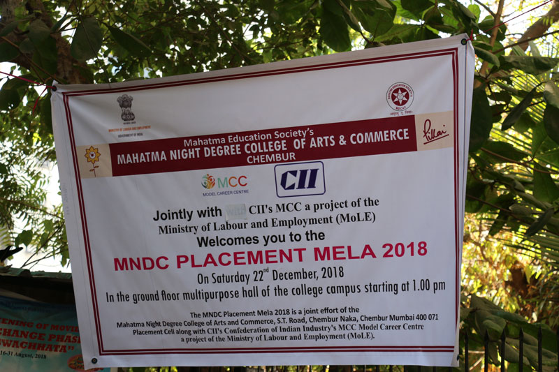 The MNDC Placement Mela 2018 was organized on Saturday, 22nd December, 2018 between 11.00 a.m. to 6.00 p.m. in Mahatma Night Degree College of Arts and Commerce, Chembur Naka, Chembur Mumbai 71. The venue was the ground floor multipurpose hall of the college campus. Eighteen companies participated in the event. They were Food Stuff; Securance; Andromedia; Rliance SMSL; Maruti Suzuki; HDFC LIFE; Pcesetters; Eureka Forbes Technical; Well Connect; ICICI Bank; SBI Bank; Calibehr; HDB Finance; ITD Technologies & Marketing Pvt. Ltd., Eureka Resources; Skynet Secure Solutions; Eureka Forbes Sales and Janaswami Chartered Accountats.
